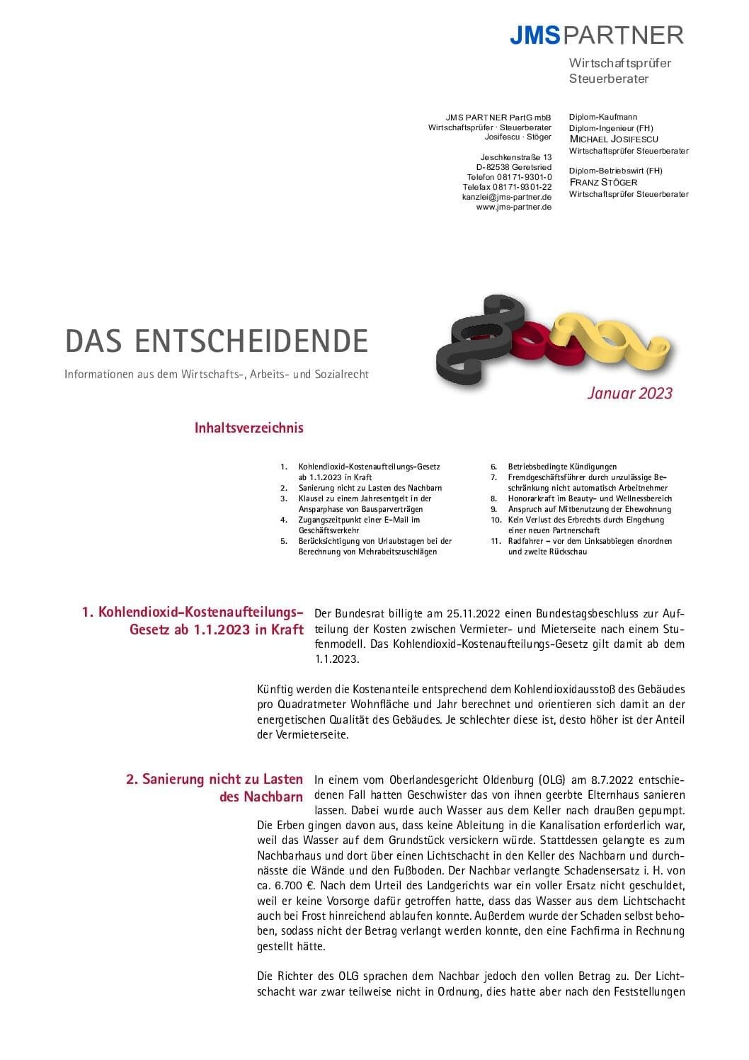 Der Bundesrat billigte am 25.11.2022 einen Bundestagsbeschluss zur Auf- teilung der Kosten zwischen Vermieter- und Mieterseite nach einem Stu- fenmodell. Das Kohlendioxid-Kostenaufteilungs-Gesetz gilt damit ab dem 1.1.2023.