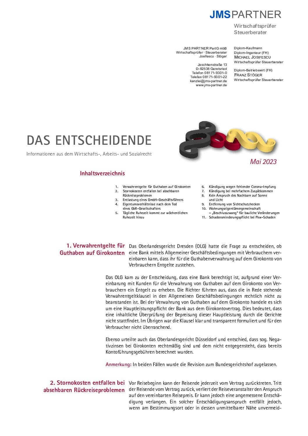 Vor Reisebeginn kann der Reisende jederzeit vom Vertrag zurücktreten. Tritt der Reisende vom Vertrag zurück, verliert der Reiseveranstalter den Anspruch auf den vereinbarten Reisepreis. Er kann jedoch eine angemessene Entschädigung verlangen. Ein solcher Entschädigungsanspruch entfällt jedoch, wenn am Bestimmungsort oder in dessen unmittelbarer Nähe unvermeidbare, außergewöhnliche Umstände auftreten, die die Durchführung der Pauschalreise oder die Beförderung von Personen an den Bestimmungsort erheblich beeinträchtigen. Der Bundesgerichtshof hat dazu in seinem Urteil v. 28.2.2023 klargestellt, dass die Frage, ob die Beförderung an den Bestimmungsort erheblich beeinträchtigt ist, nicht allein danach beurteilt werden darf, ob der Reisende diesen Ort ohne Beeinträchtigungen erreichen kann. Vielmehr kann auch von Bedeutung sein, ob der Reisende davon ausgehen kann, dass die Rückreise nach Ende des Reisezeitraums ebenfalls ohne wesentliche Beeinträchtigungen möglich sein wird.