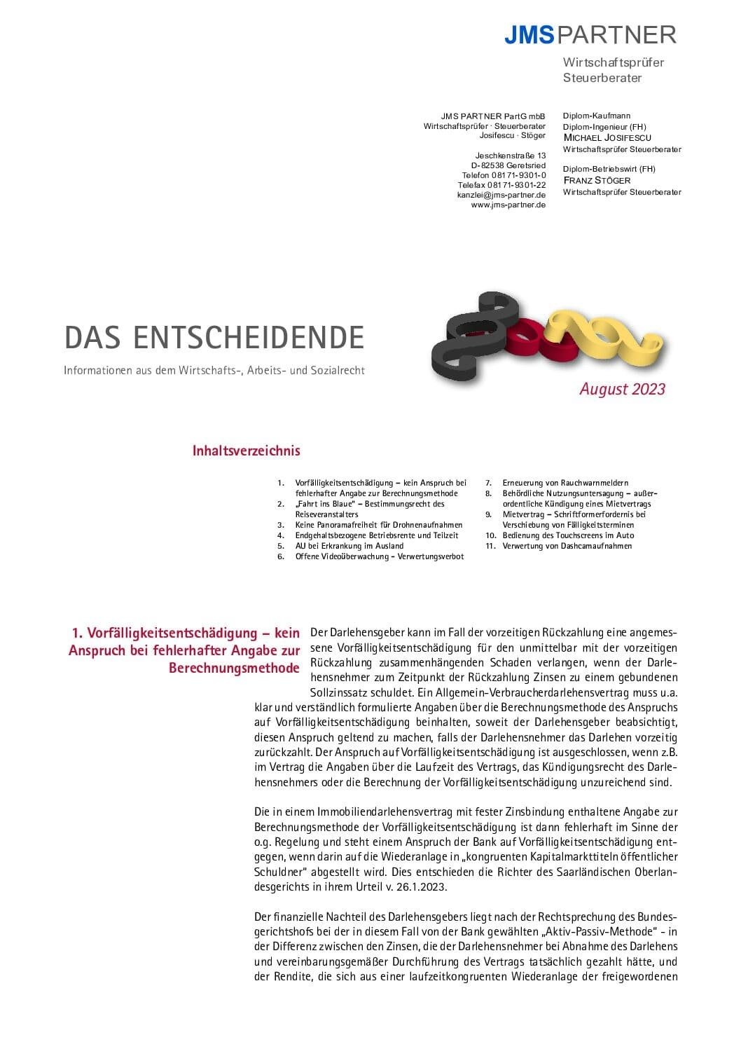 1. Vorfälligkeitsentschädigung – kein Anspruch bei fehlerhafter Angabe zur Berechnungsmethode